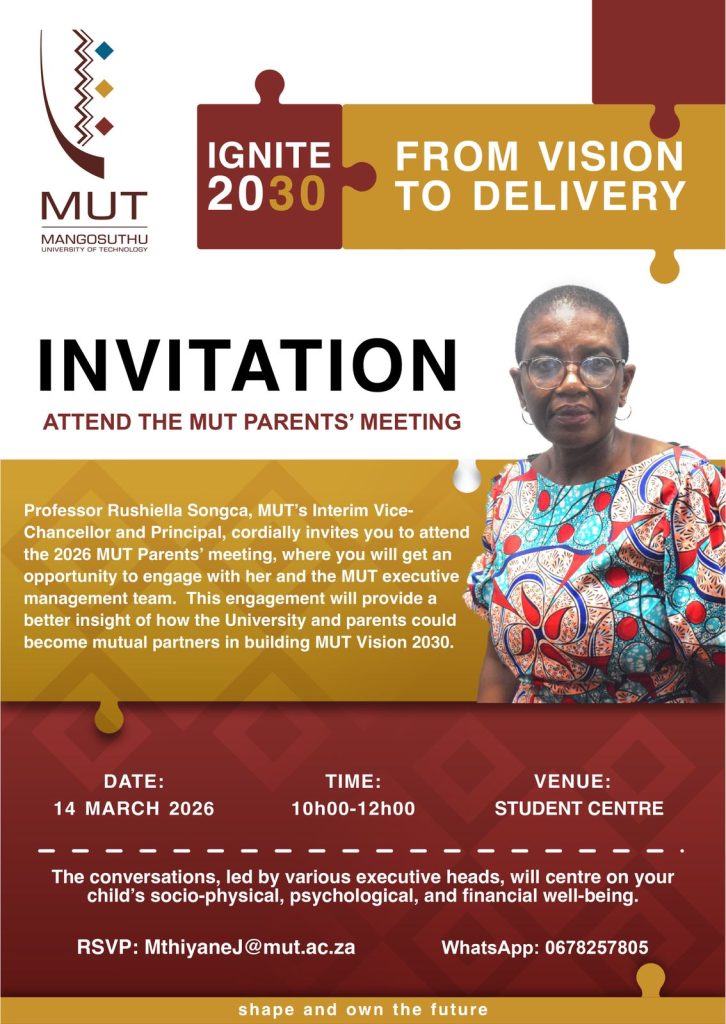 Professor Rushiella Songca, interim Vice-Chancellor and Principal at MUT, cordially invites all parents of MUT students to attend the parents’ meeting where she will engage them on her 100-Day plan to ensure there’s stability at MUT and to craft a way forward for MUT to implement MUT’ Strategy 2026-2030.