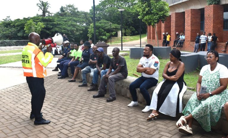 The MUT health and safety team continues emergency drills to prepare staff, students, service providers, and guests within the University for any emergency. This initiative is supported by Council and University management, who advocate the ‘safety first’ culture. Lizwi Masondo, Safety, Health and Environment Officer and team leader, said they were conducting the drills so that everyone within the University would have the necessary information and develop the required habits to deal with emergency situations. The latest drill was conducted in the Student Centre on 12 November 2025. Both staff and students responded well; they left the building and waited at the designated assembly point, where Masondo addressed them. Pinky Gwala, of the Financial Aid Office, set the example. She was one of the first staff members to rush out, wait on the spot, listen to the message from Masondo, and was among the last to return to the office