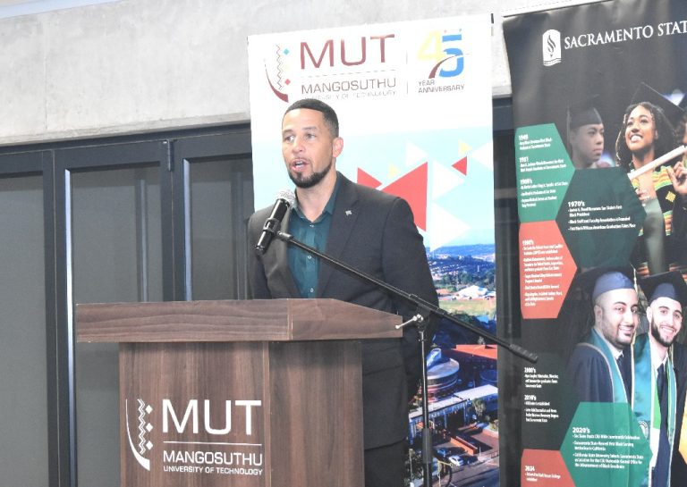 In efforts to create strong ties with national and international partners, the University has at the forefront of its internationalisation programme its students and its immediate communities as the direct beneficiaries. To this end, the organisers of the two-day meeting between MUT and the US’s Sacramento State University decided to include students from the BB Campus’ Coastal College and learners from some local high schools. On 5 November 2025, at MUT’s Student Centre, together with MUT staff and students, the Coastal College students and the learners had a great opportunity to listen and learn from the President of Sacramento State University, Dr Luke Wood. Dr Wood, who achieved his academic qualifications at a very young age – wrote his first book while he was studying towards his PhD, used his life to illustrate to the listeners that a person’s life should not determine their future. This is a familiar phrase