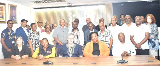 Dr Phiwayinkosi Gumede, seated, right with CHE and SAQA teams, also seated, and MUT staff