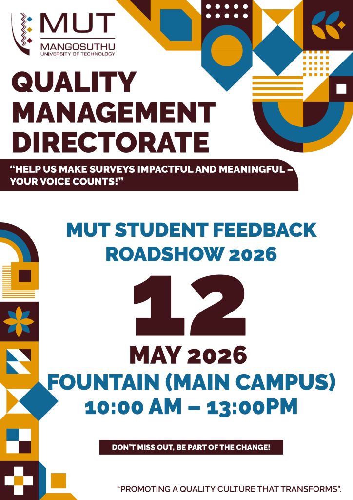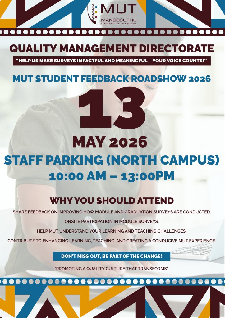 The purpose of the MUT Student Feedback Advocacy Roadshow is to raise awareness about the importance of module surveys, encourage greater student participation, and promote a strong feedback culture that supports continuous quality improvement in teaching, learning, and student support services.