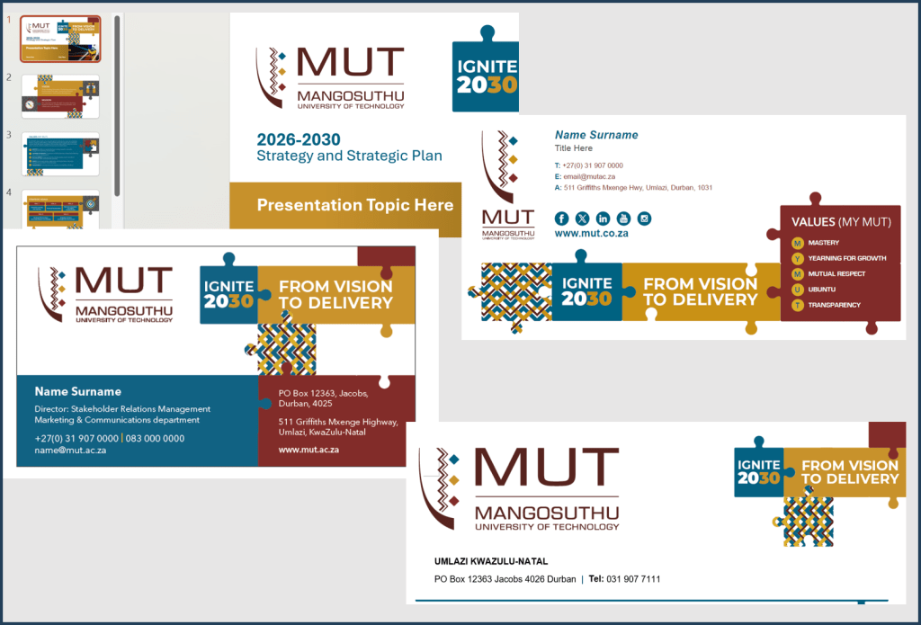 Imagine a world where every email signature, Word document, social media branding, and PowerPoint presentation echoes the energy of IGNITE 2030! These newly minted templates are a powerful statement of MUT’s commitment to a cohesive and impactful identity that resonates with its IGNITE 2030.